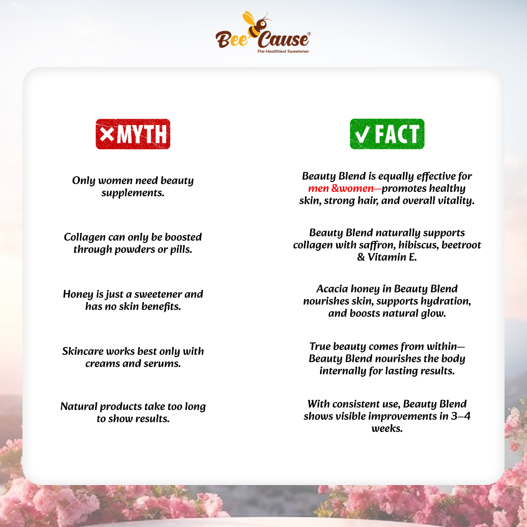 Unlock the secret to radiant and youthful-looking skin with BeeCause Beauty Blend. Our unique blend of natural ingredients, including Borage oil, Primrose oil, Beetroot powder, Orange peel powder, Hibiscus powder, Rose petal powder, Saffron, Vitamin E, and Acacia honey, is designed to nourish and rejuvenate your skin from within. 🌸✨
