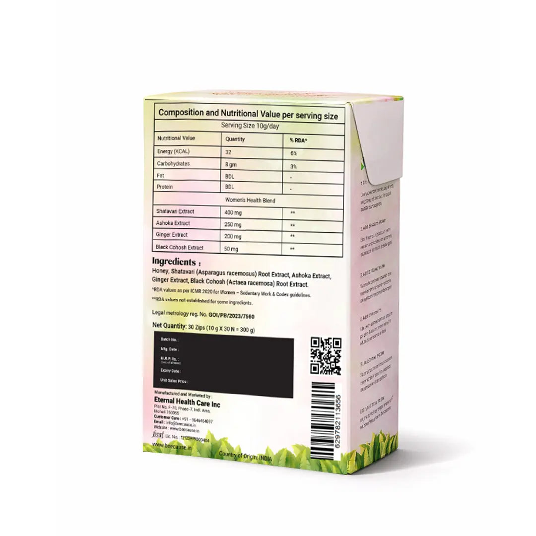 Unlock a smoother, healthier cycle with BeeCause HerBalance. This top-quality women's wellness honey blends pure honey, Shatavari, Ashoka, Ginger, and Black Cohosh. It works from within to balance hormones, ease menstrual discomfort, and restore your daily energy. It is 100% natural, with no artificial additives or refined sugar.