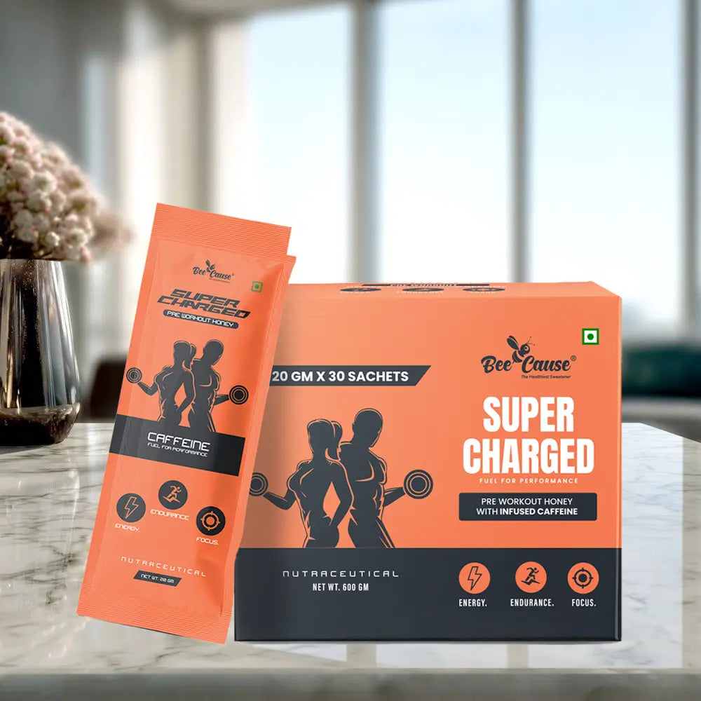 BeeCause SuperCharged is a natural pre-workout made with only Raw Honey and Caffeine. Each box has 30 sachets of 20g, designed to give clean energy and stamina without the crash.
