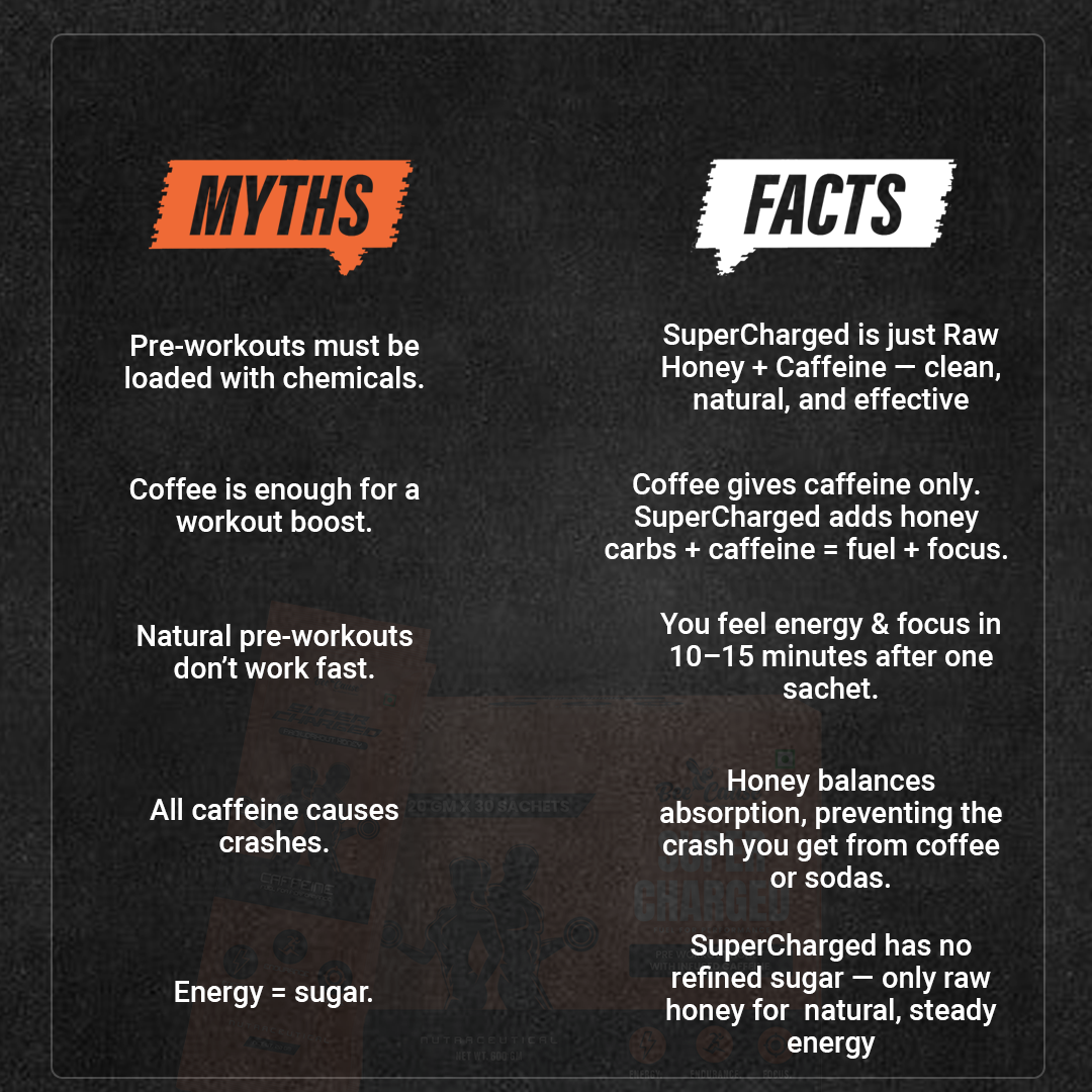 Most pre-workouts are filled with artificial flavors, synthetic stimulants, and excess sugar. SuperCharged is clean, natural, and effective—just honey + caffeine.